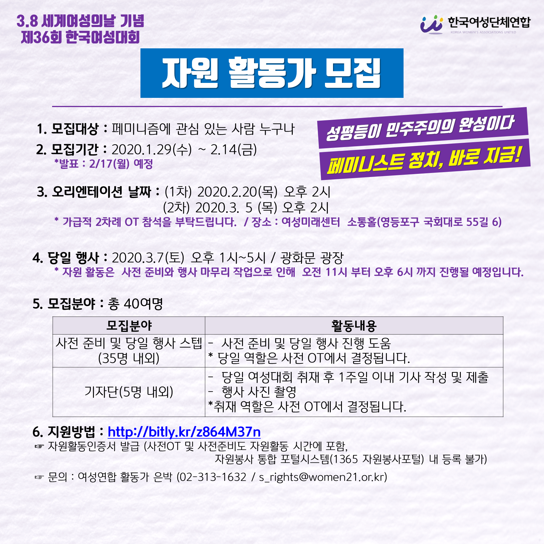 안전한 출산을 가로막는 장애물 중 하나는 여성 의사·조산사가 부족하다는 것이다. 이어 '세계 여성의 날'에 맞춰 여성 정책 공약을 발표하다 보니 부득불 구색 맞추기가 필요했던 것인가라며 오늘 저와 안철수 국민의당 후보 누구나 야권 단일후보가 박영선 후보를 이긴다는 여론조사 결과가 나오자 행여 압박을 느껴 급하게 사과한 거라면 자충수를 둔 것이라고 덧붙였다. 하지만 시야를 조금만 더 넓히면 보다 다양한 층위가 보인다. 셀마 헤이악은 멕시코 및 미국 영화의 배우이자 감독, 프로듀서로도. 유엔이 여성의 권리 향상을 위해 공식 지정한 기념일이다. 꼭 정색하는 사회학 서적이 아니더라도 '내가 살아가는 사회'를 조망한 책은 꽤 많다. 그곳에서 내 남편이 될 사람은 누구? 한국씨티은행, 2021 세계 여성의 날 기념 '특별 대담' 개최. 갑자기 게임 속으로 빨려들어온 것도 당황스러운데, 내시라뇨…? 엘리시온의 신부 작가 왕보라,한솔,흰설탕 총편수 총 15화 남성만 존재하는 세계, 엘리시온. 브랜드 설립 이후, 한 번도 빠짐 없이 해마다 여성의 날을 2019년 여성의 날. 국제 여성의 날 또는 세계 여성의 날은 여성의 정치·경제·사회적 업적을 범세계적으로 기리는 날이다. 아리랑 tv 4angles • 방송 일자 :